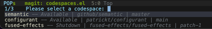 codespaces-connectbrings up a list of codespaces, and upon selection opens a Dired buffer in/workspaces(the default Codespaces location).codespaces-startbrings up a list of inactive codespaces and upon selection spawns a task that starts the selected codespace.codespaces-stopdoes the same but for stopping active codespaces.